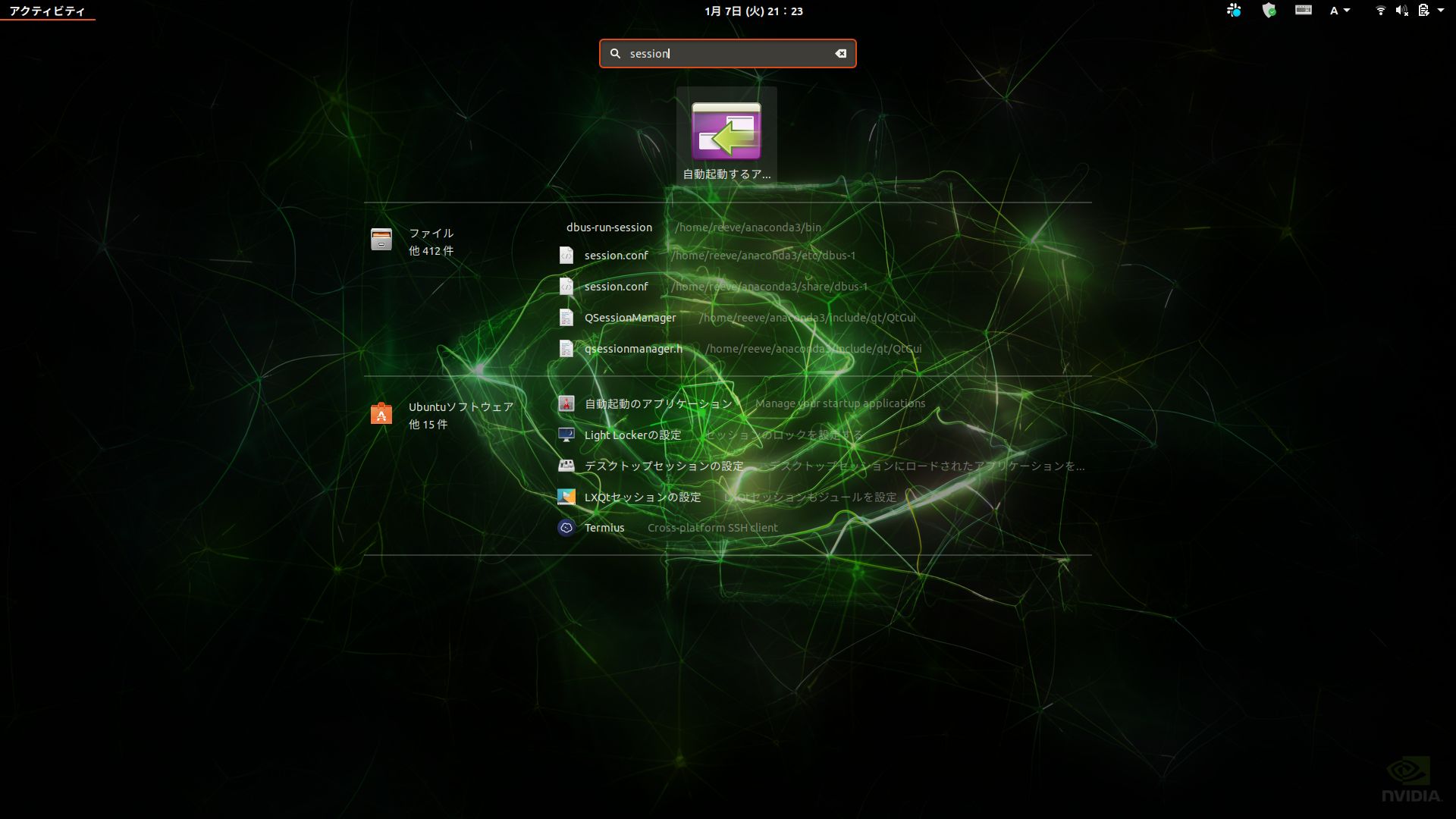 まず、画面左下のアプリケーションを表示するを開き、sessionと検索し、自動起動するアプリケーションの設定を開く。